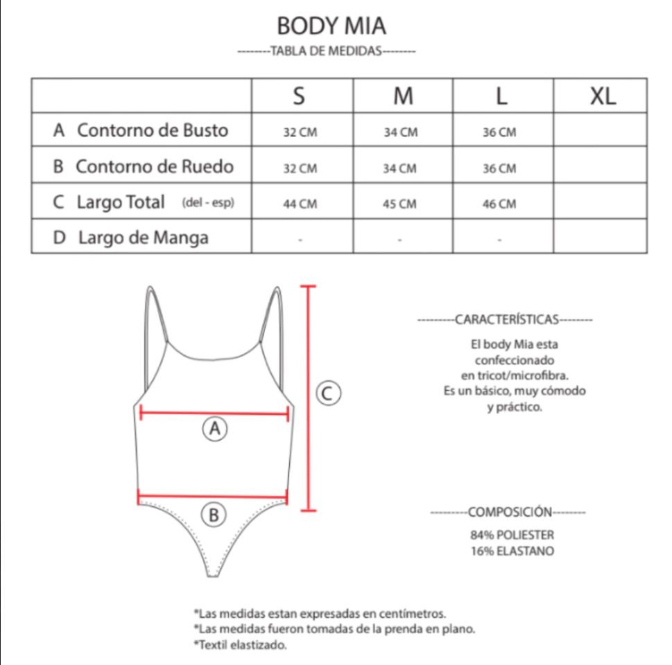 Body confeccionado en tricot/microfibra, de breteles finos. Con cierre de gancho en la parte inferior, lo que lo hace súper cómodo. Además tiene doble tela en el pecho para que te sientas más segura.