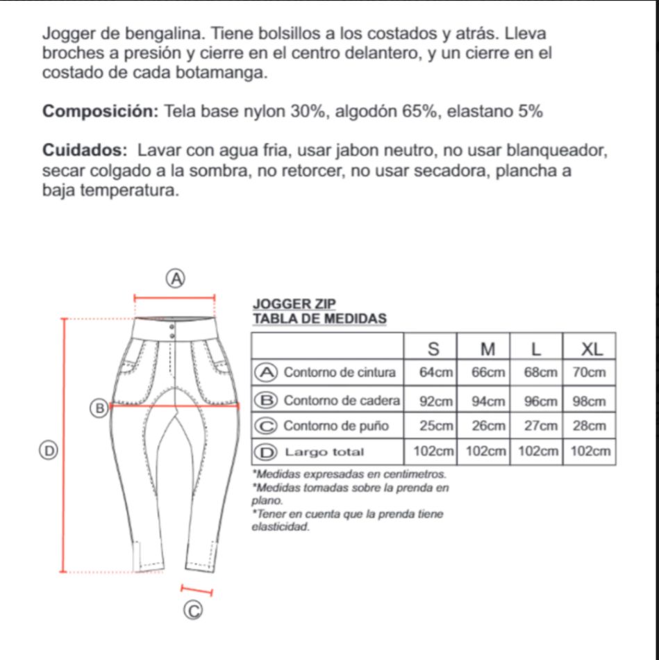 Jogger confeccionada en tela de bengalina con cierres en los costados en la parte de abajo del puño. Diseño versátil tanto para el día como para la noche.